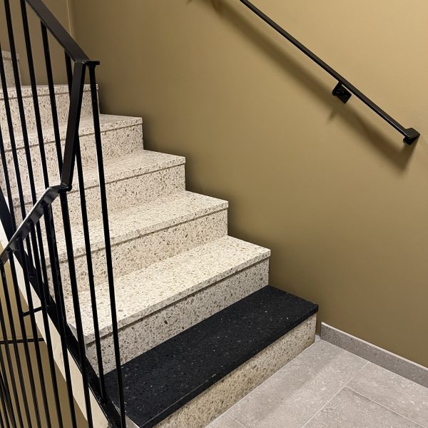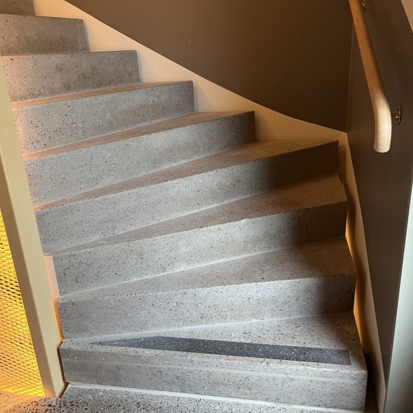 • Trappa i finslipad gråbetong med ingjuten kontrastmarkering i terrazzo