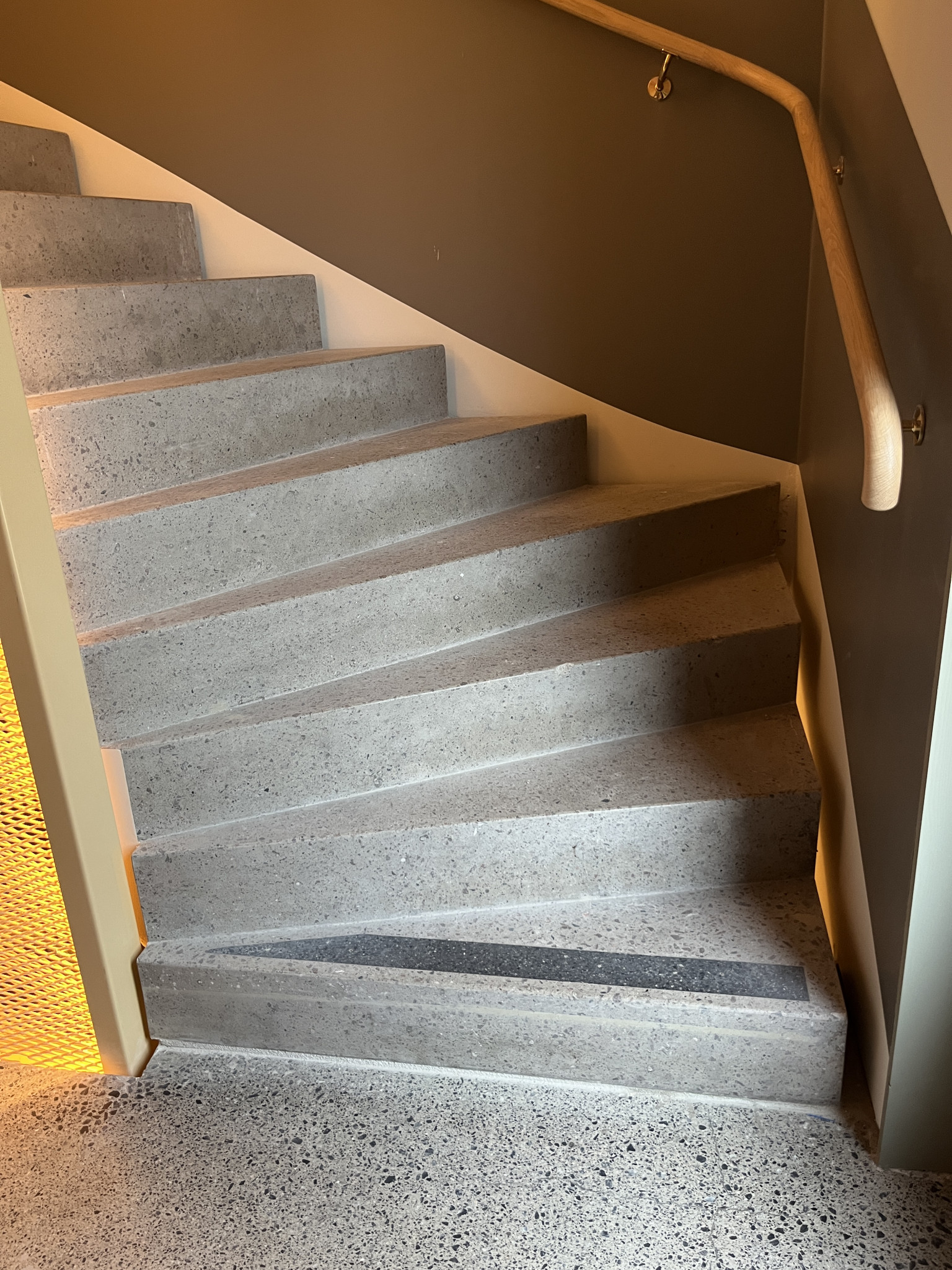 • Trappa i finslipad gråbetong med ingjuten kontrastmarkering i terrazzo