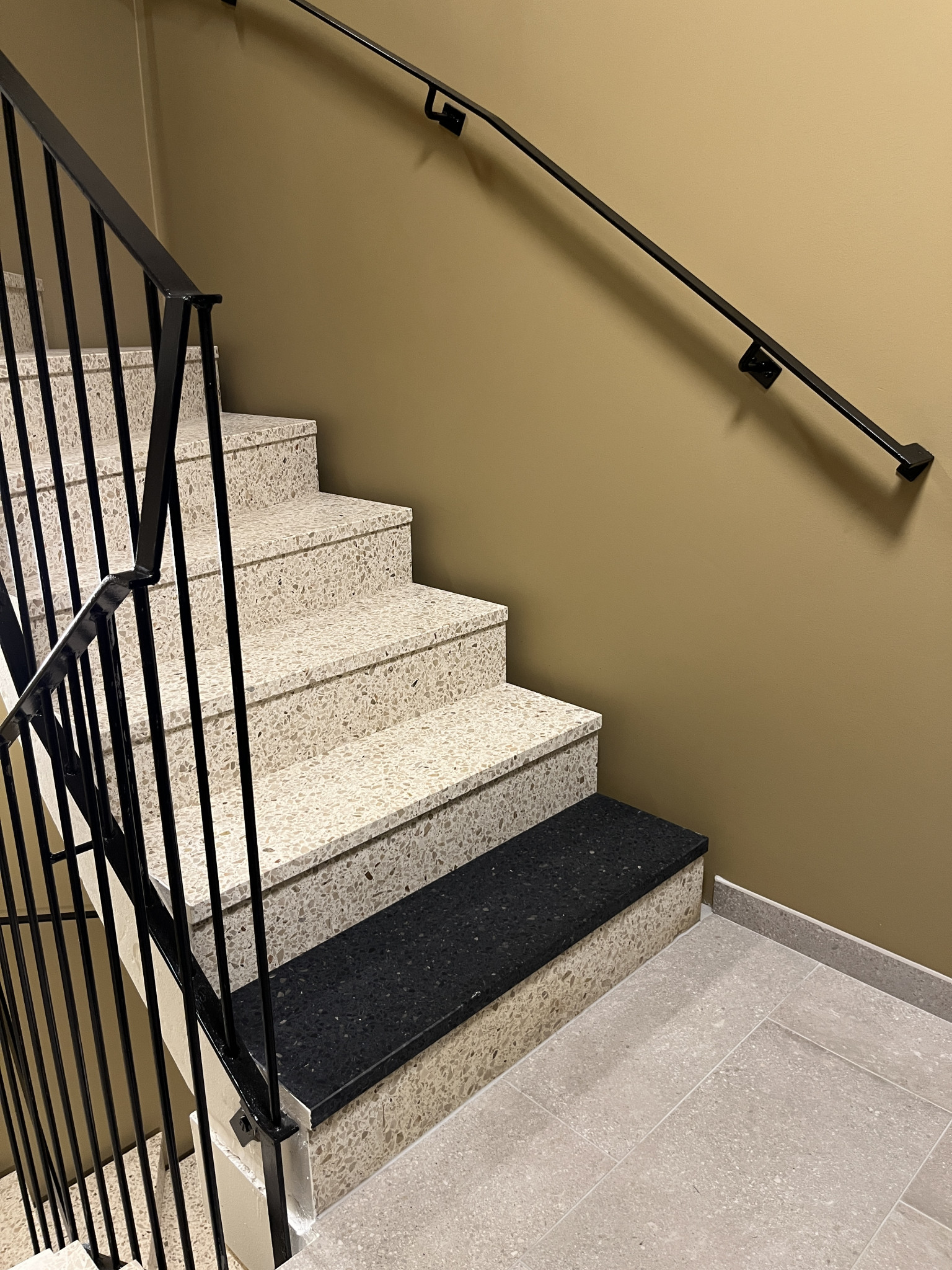 • Trappa med förtillverkade terrazzoplattor med kontrastmarkering i helt steg